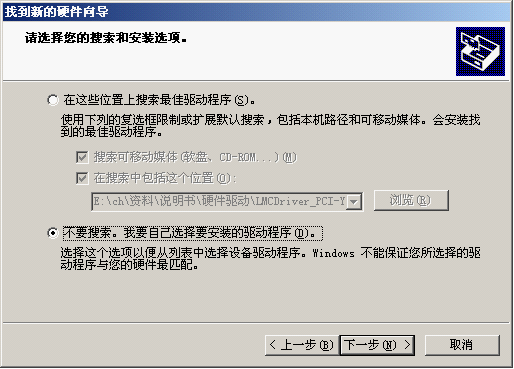 2、选择“不要搜索,我要自己选择要安装的驱动程序”,然后点下一步